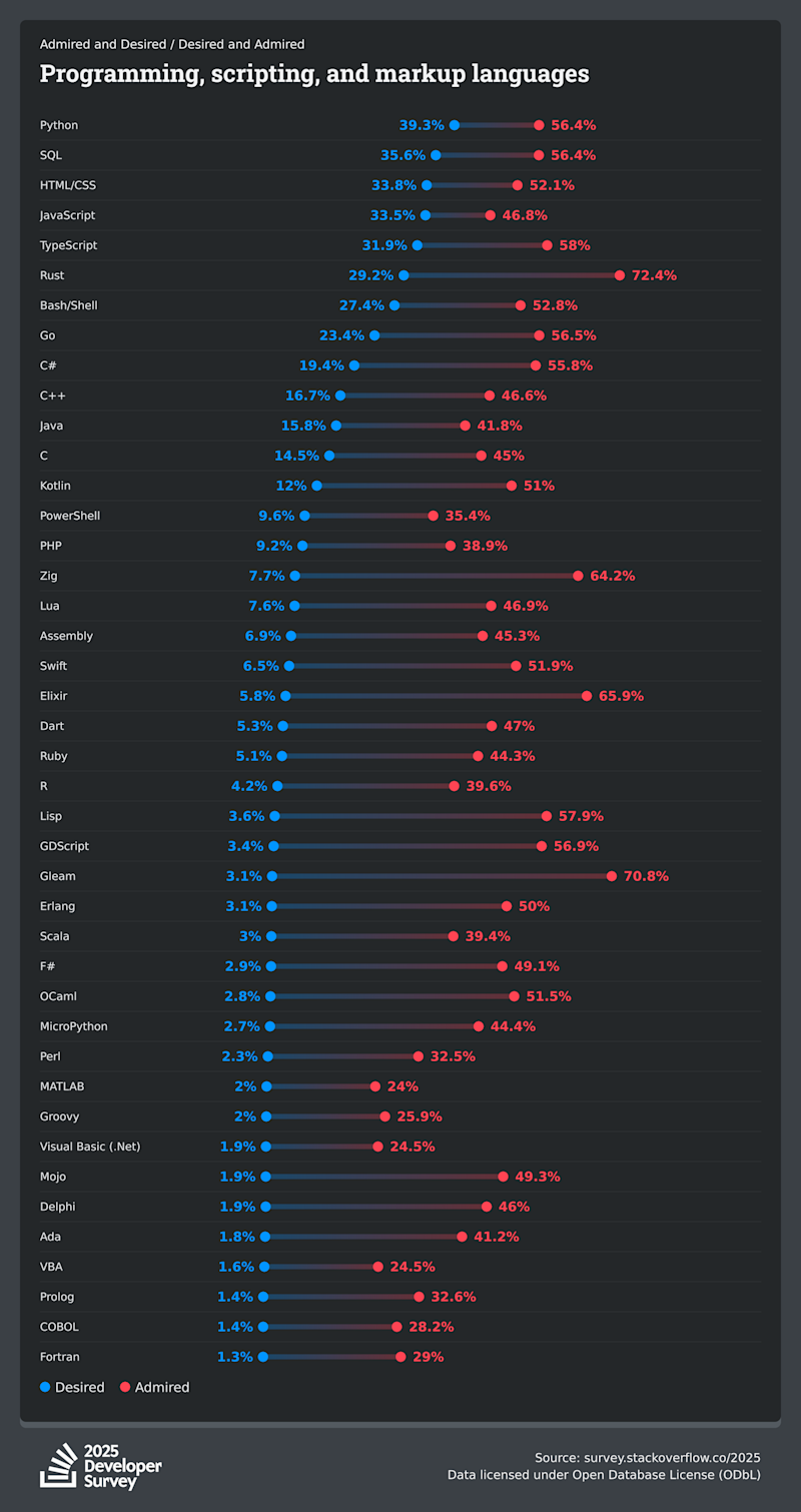It's not the most clear chart to understand, but basically the red number is how much people enjoy using that language, while the blue number is how many of the people surveyed want to use the language.