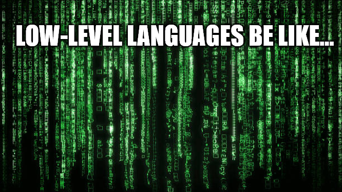 Low-level languages are very similar to machine code, which can be hard to understand at first. It looks kind of like what you might see in the Matrix movies: