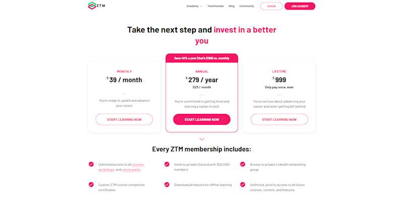 Here at Zero To Mastery, we have a monthly membership at $49, an annual membership of $299, and a lifetime option of $1,299.