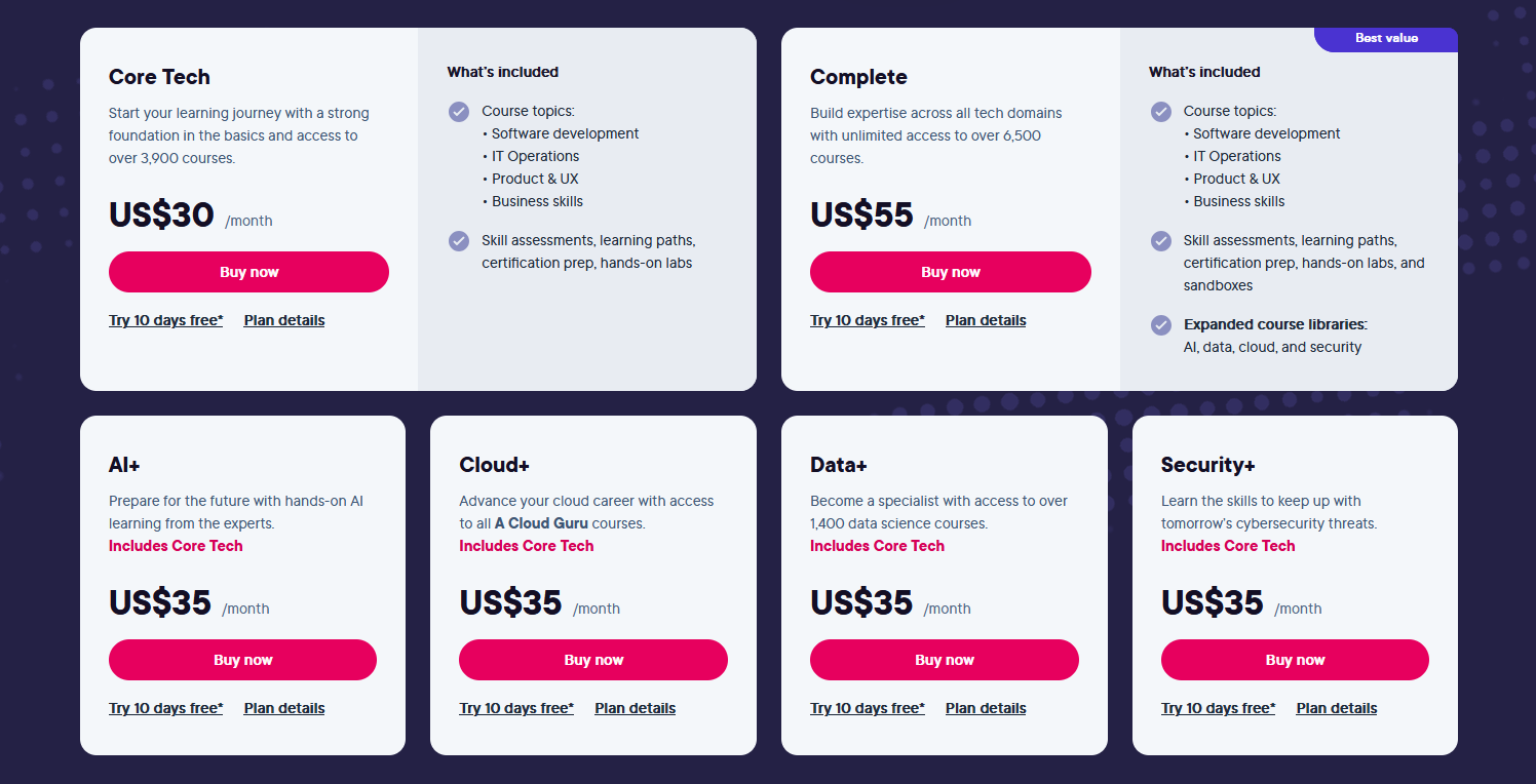 Core tech is $30 a month and gives you access to 3,900 courses (of the 6,500 total)