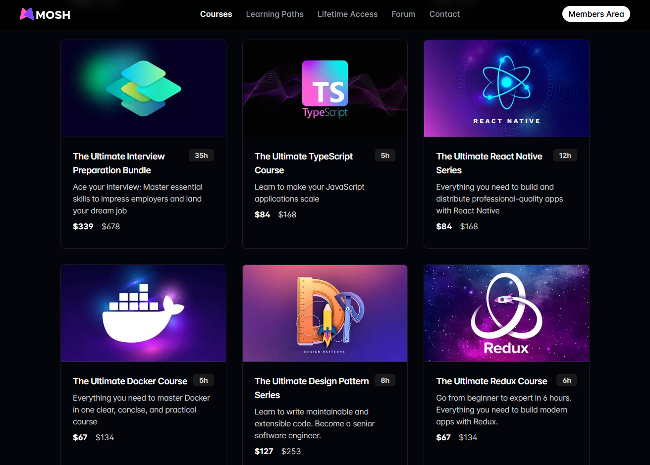 He has a private community, courses on popular languages and frameworks, as well as learning paths for specific roles such as front-end, back-end, mobile or game development.