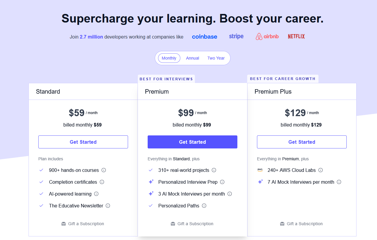 The standard option gives you access to courses and certifications, while the premium model offers the same, but also includes projects and career/skill paths. I would argue that to fully learn, you should be working on projects that are aligned with your course.