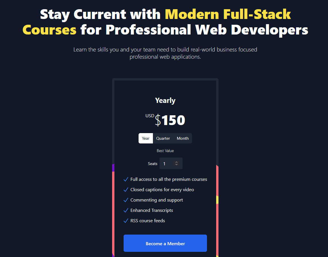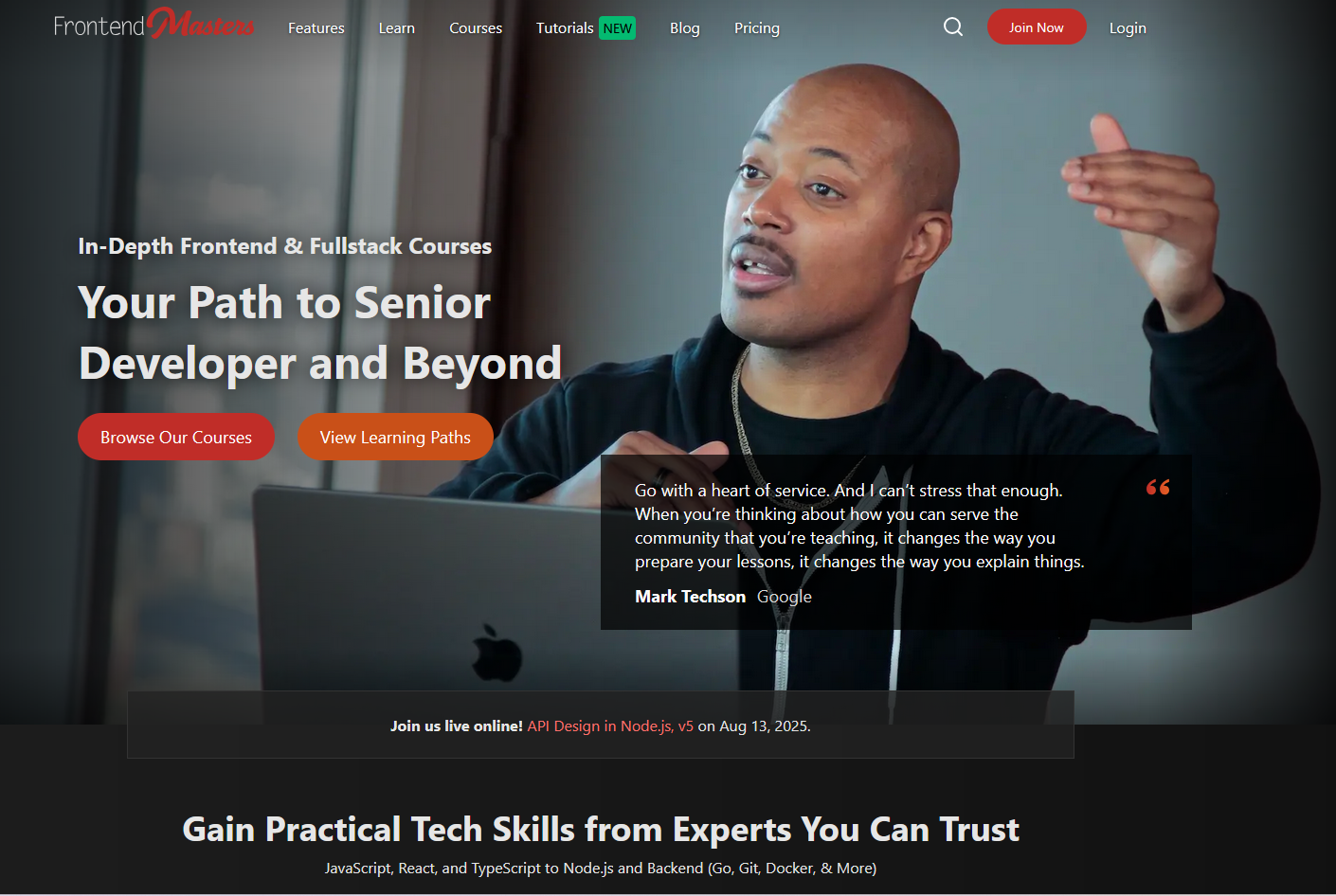 Frontend Masters are my top pick for if you already can code, and are looking to upskill into a more senior dev role, as that's a large part of their curriculum.