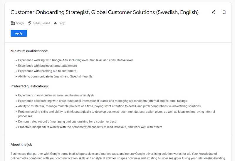 The only outlying request here is that you can speak English and Swedish, as that's the customer base for that particular position - but that's fairly unique. They have the same role in English only also.
