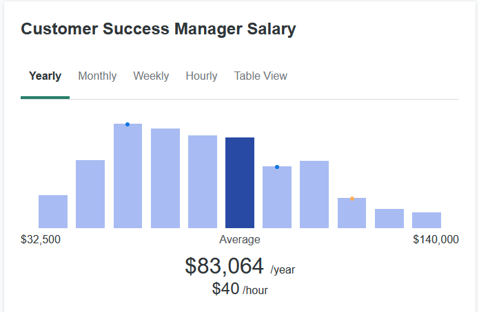 Salary varies based on company and location, but the average salary for an entry-level customer success manager role on ZipRecruiter is currently $83,064 per year.