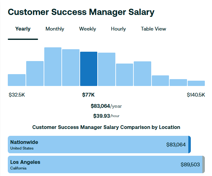 Salary varies based on company and location, but the average salary for an entry-level customer success manager role is much higher than customer support. In fact its almost double at around $83,064 per year.