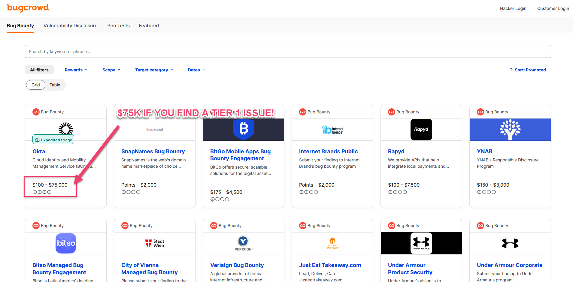 You can also make really good money on the side finding bugs. This one is offering $75k if you can find a tier 1 issue!