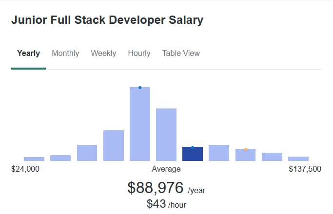 However, the average full-stack junior developer salary is around $88,976.