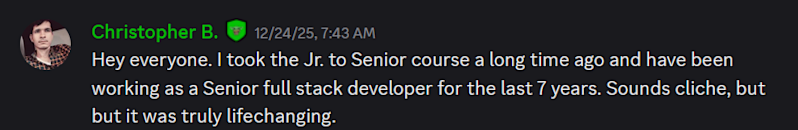 Editor’s note: Here at ZTM we’re big believers in pushing into more senior roles ASAP, simply because the gap isn’t that far. It’s just picking up specific skills that junior devs miss. Because of this, we cut a lot of the stuff you don’t need, while adding in everything to make you the perfect hire. This is why so many of our students tell us that their interviewer was blown away by the projects and skills!