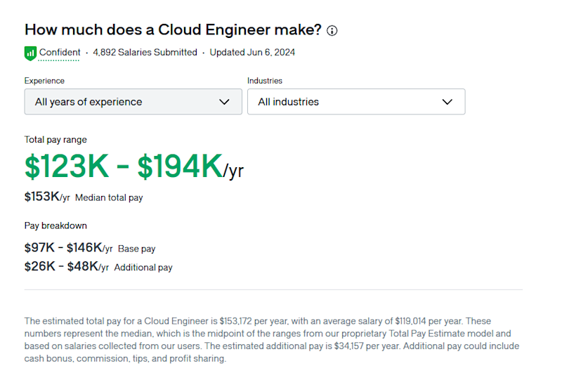 According to Glassdoor, the average salary for a Cloud Engineer in the U.S. is over $153,000 per year.