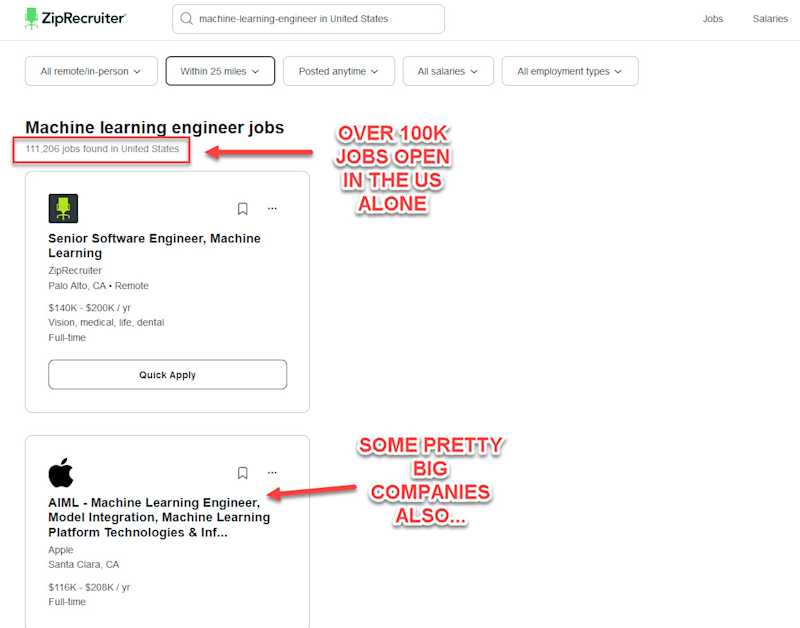 As for job demand, a quick look at ZipRecruiter shows 111,206 ML Engineering jobs available in the US right now.