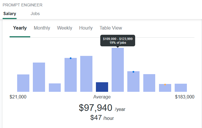 According to the 10,000+ jobs listed on ZipRecruiter, the average salary for a Prompt Engineer is around $97,000 per year: