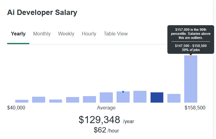 However, according to ZipRecruiter, the average salary for an AI Developer in the US is $129.348 per year, with around 40% of those jobs offering around $158,000.