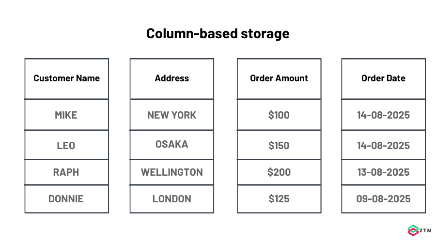 Let’s say you want to calculate total sales by month. In a row-based system, the database still has to scan through every single row, even though you only care about two pieces of information: the “sale amount” and the “sale date.”