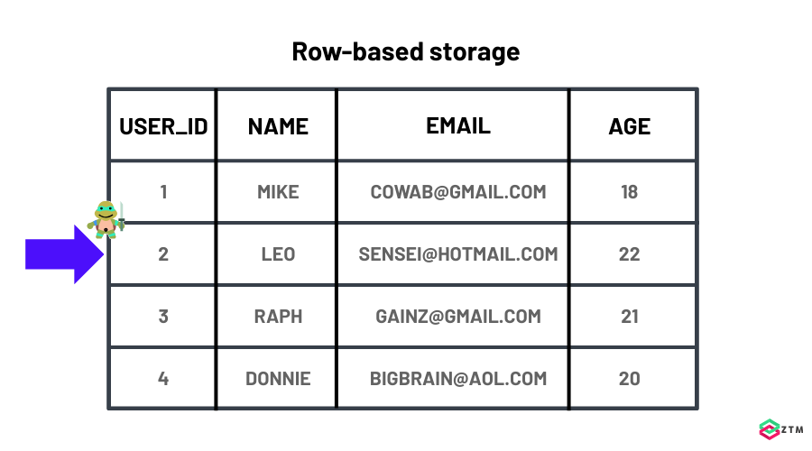 The reason OLTP systems can respond so quickly starts with how they organize their data. To achieve low latency when processing requests, OLTP databases use a so-called “row-based” storage, where all fields for a single record (shop item, user data, etc.) are stored together, one field after the other.