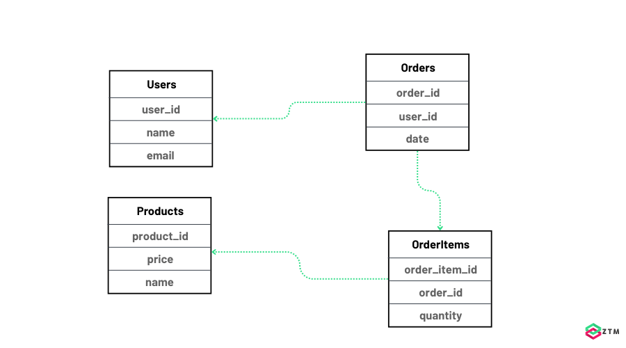 Instead of storing a customer’s name and email in every order, the system puts that information in a single Users table. Every time an order is placed, the Orders table just references the customer’s ID.