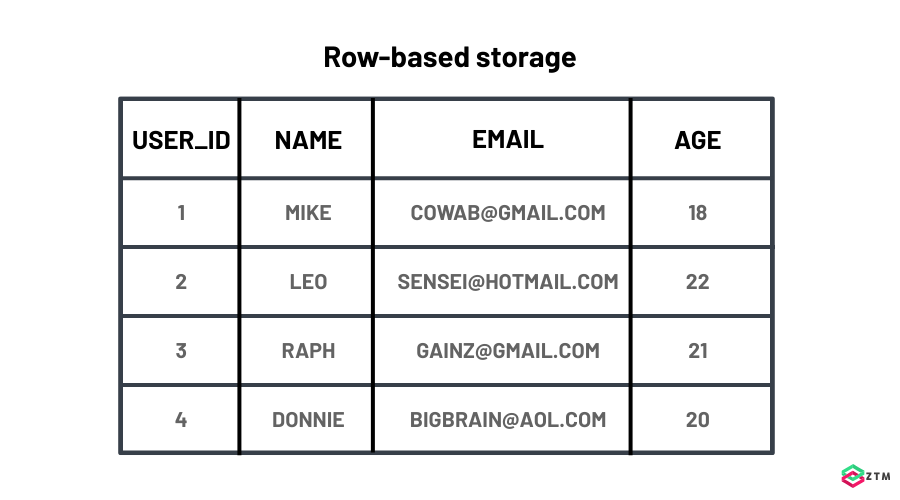 As I mentioned earlier, most OLTP databases store data in a row-based format. Think of it like one huge spreadsheet containing all your data. On that spreadsheet, each row is a complete record: customer name, address, order amount, date, and so on.