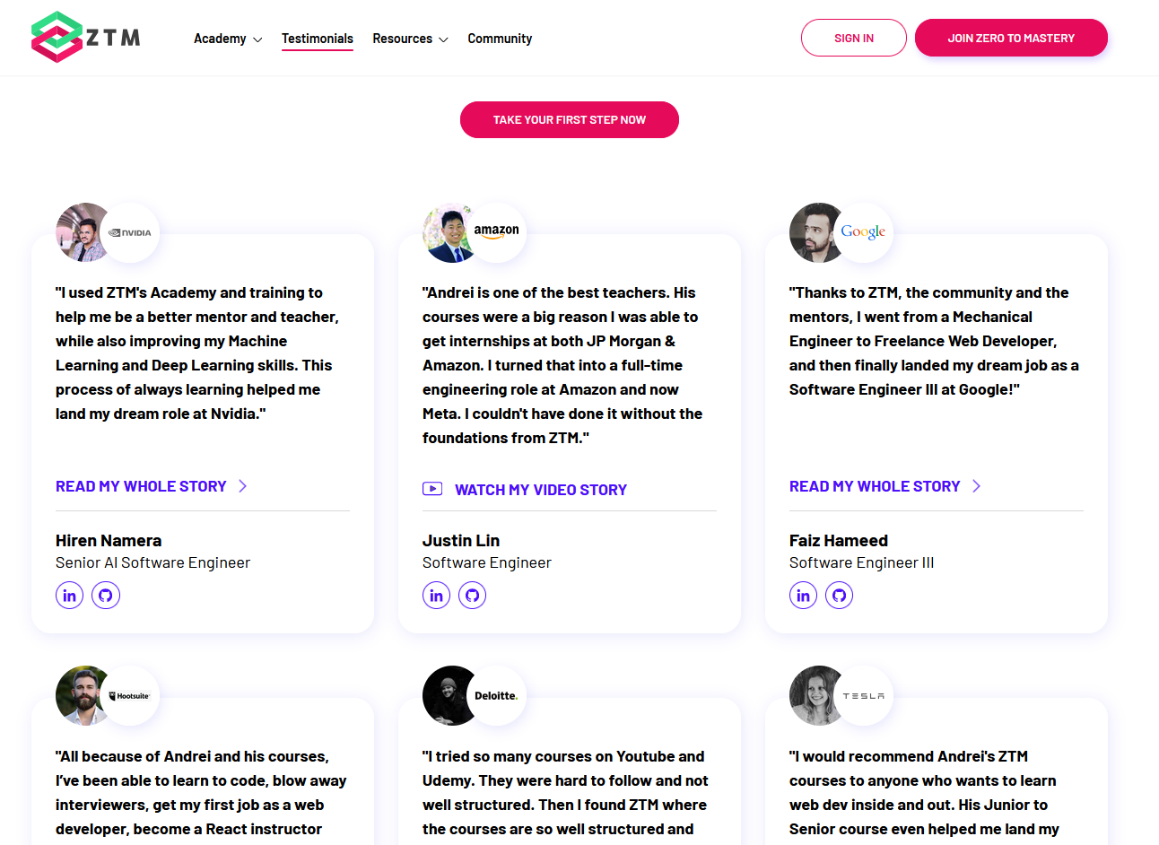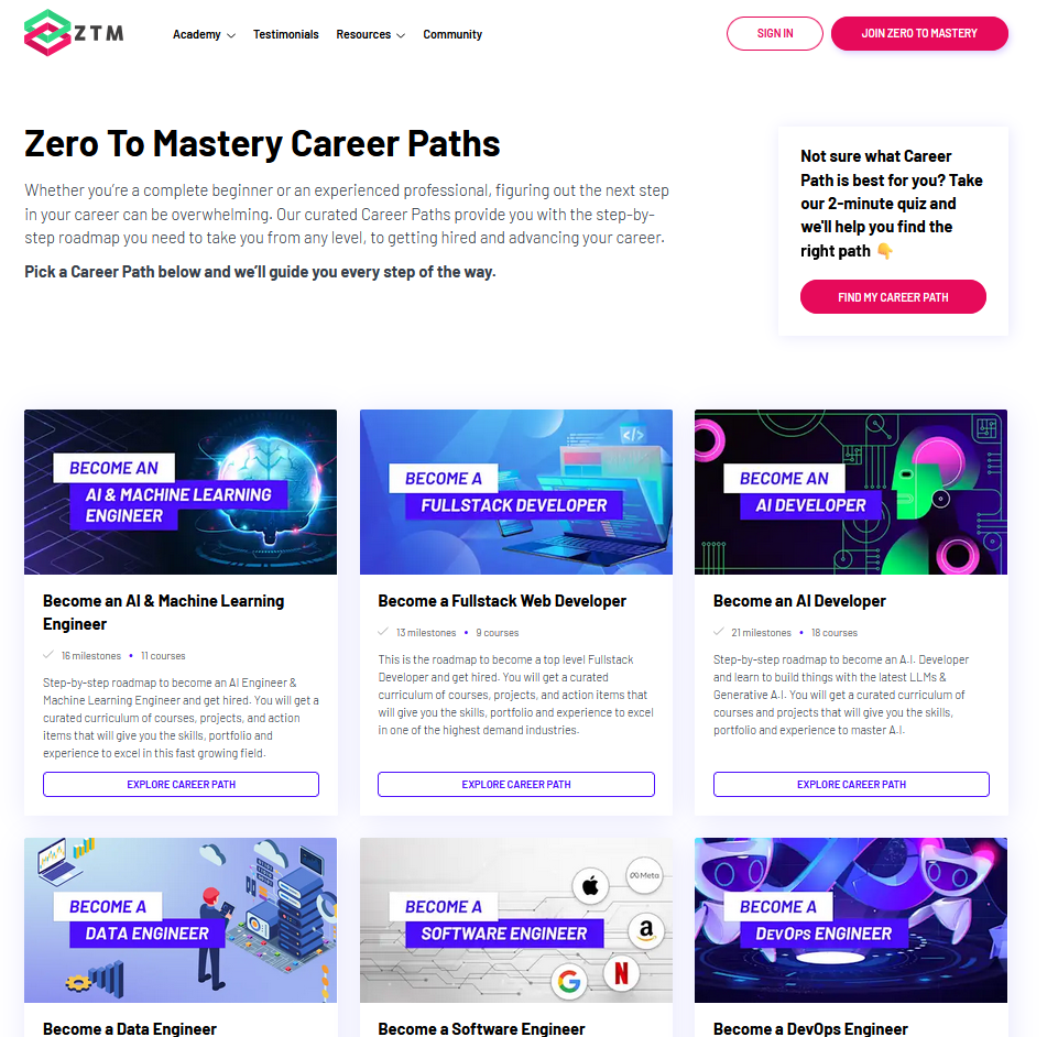 Here at Zero To Mastery, we’re a tech training platform with some slight differences from others out there.
