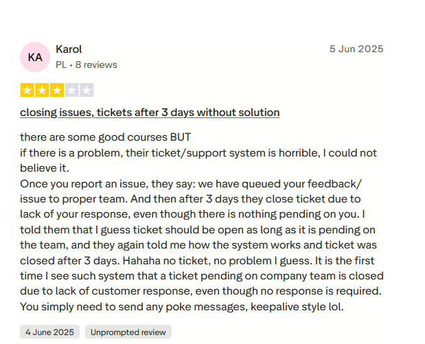 That said, they have had 5-star reviews in the past 2 months, so that’s a good indicator that not everyone is having a bad experience. Although users are frustrated with some of the billing issues and refunds (if you watch more than X of a course, you void the 30-day refund window, apparently).