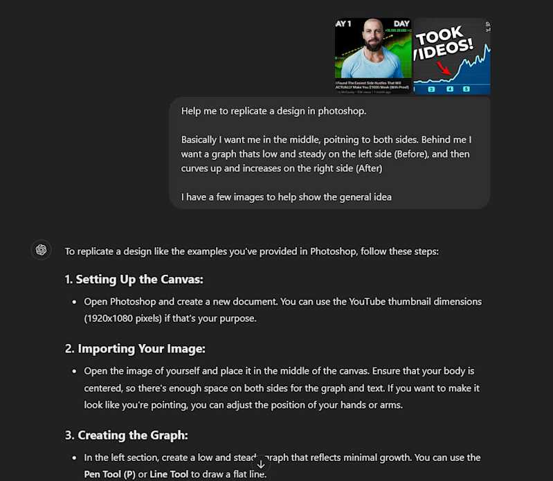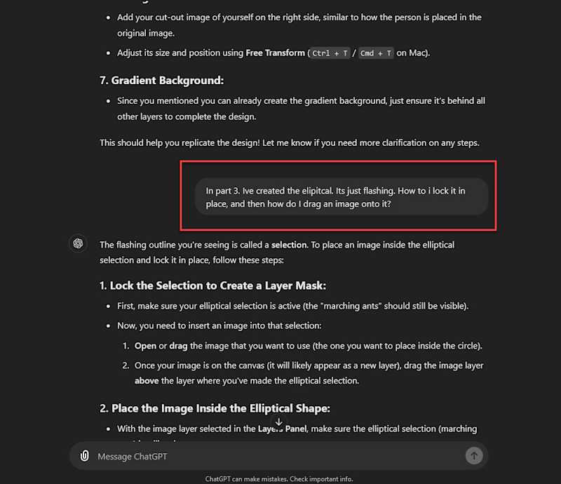 Editor's note: I’ve been learning to use Photoshop on the weekends, and wanted to replicate a design I saw, so I did this exact same thing. I told ChatGPT my goal, which elements I wanted to replicate in my own design, my level of editing experience, and then shared multiple example images.