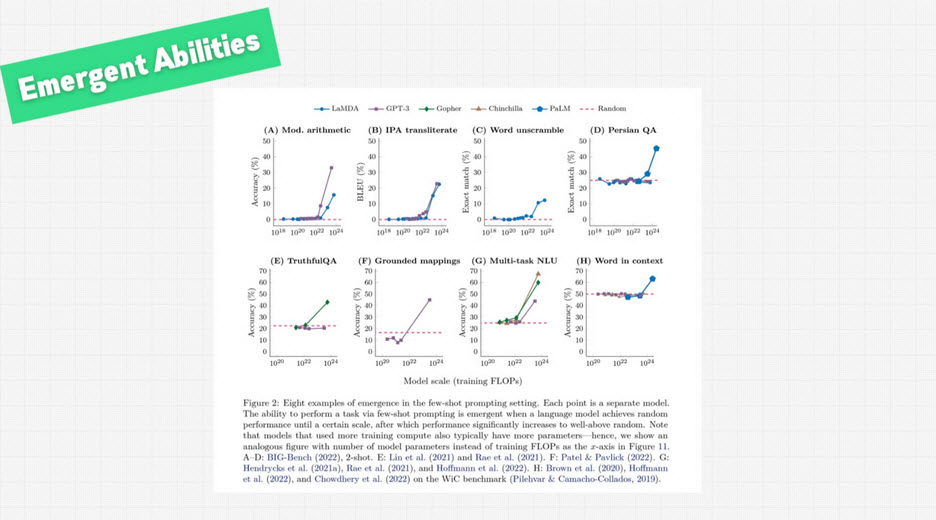 As you can see, model capabilities do not improve linearly. Instead, they may be flat at first, but then at a certain model size the abilities emerge.
