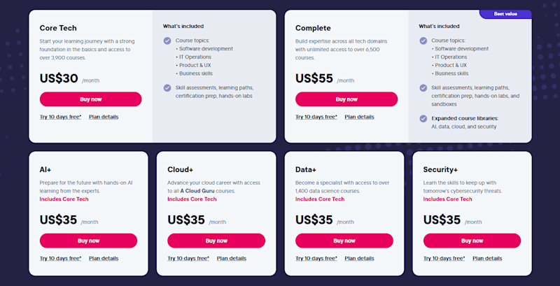 Core tech is $30 a month and gives you access to 3,900 courses (of the 6,500 total)