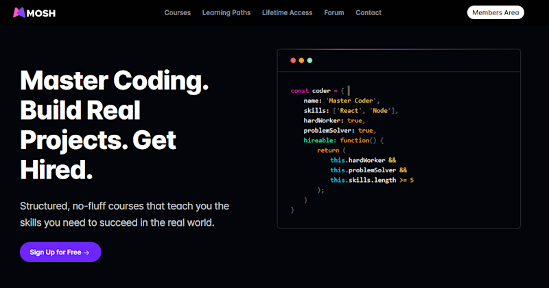 Code with Mosh | 4.7/5 | $50–$400 per course or $678 lifetime | Low cost, lifetime deal, also covers interview prep | Limited support, no free tier |