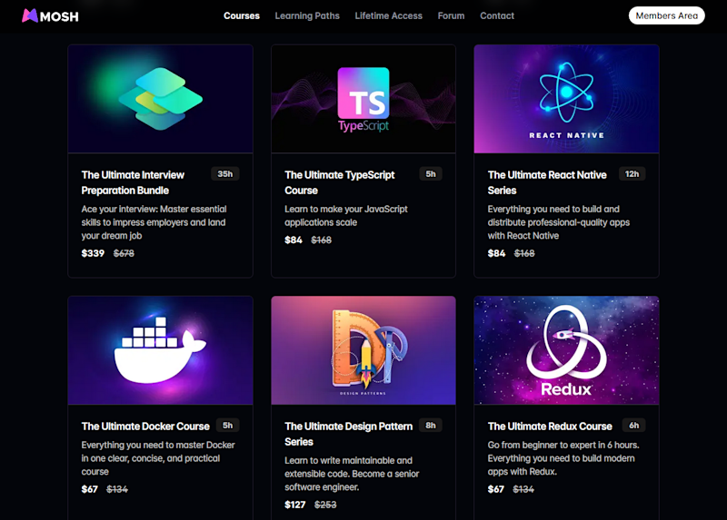He has a private community, courses on popular languages and frameworks, as well as learning paths for specific roles such as front-end, back-end, mobile, or game development.