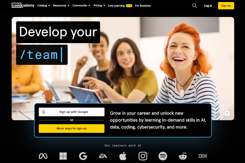 Codecademy | 2.7/5 | Some free content, then $15–$40/month, depending on whether paid annually upfront | Huge catalog, career/skill paths, active community | Career support locked at Pro price point, uneven course quality |