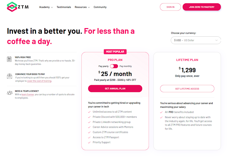 Zero To Mastery | 4.9/5 | $49/mo, $299/yr, $1,299 lifetime access, or complete learning challenge for free lifetime access after | Career-focused, constantly updated, thriving community, generous free course previews, lifetime access options | Free content is either the blog or X hours of courses via our YouTube channel |
