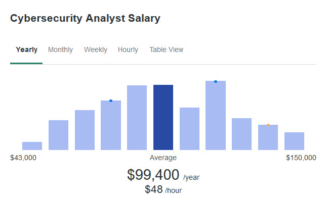 Average salary: There are a number of different roles in Cybersecurity, so the average salary can vary. Analysts get around $99,400, while Penetration testers get around $119,895 per year