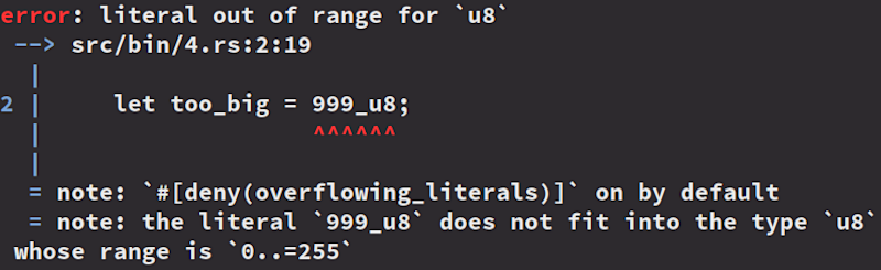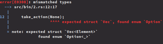 }In contrast to the Python code, we won't even be able to compile this Rust code, let alone run it, because we would get 5 compiler errors that look something like this: