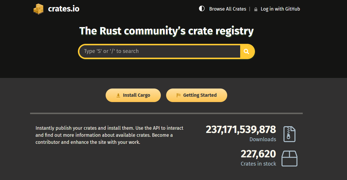 The Rust ecosystem is what really drives the Rust development experience. There are over 200,000 crates available, all complete with auto-generated documentation. (A "crate" is a Rust code library).